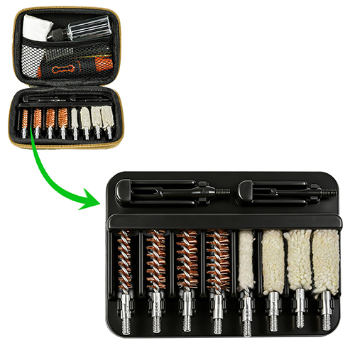 ہینڈگن کلیننگ کٹ میں 4 سائز (.22, 9mm, .40, .45cal.) شامل ہیں۔ OX کپڑا لیپت زپ کے ساتھ پیویسی کیس. پیتل کے برش اور روئی کے موپس، 2 سلاخیں۔ ریت اور سیاہ انتخاب کے لئے رنگ.